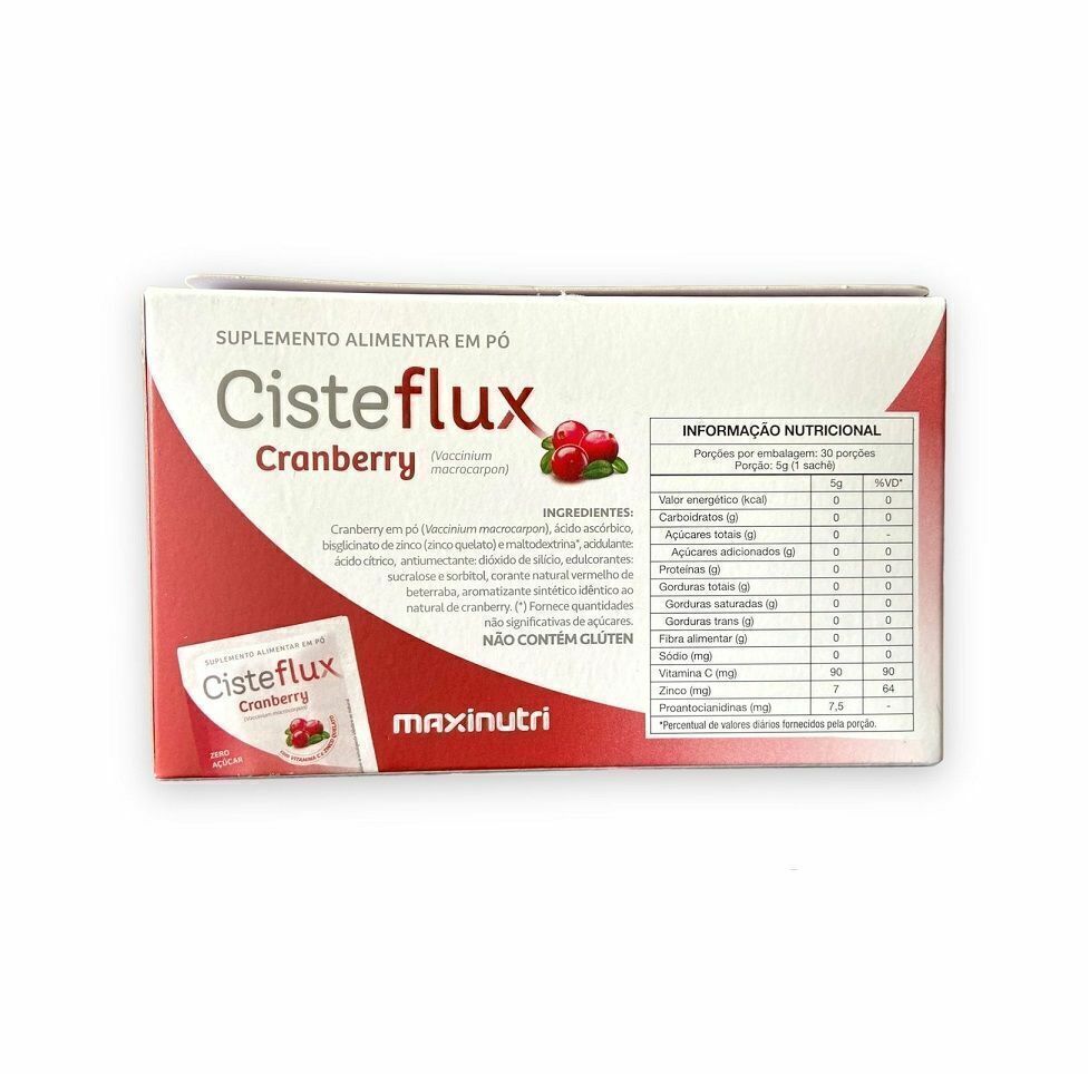 Cisteflux Cranberry Display (30 sachês de 5g)       O Cisteflux Cranberry associado à Vitamina C e ao Zinco tem propriedades antioxidantes e seus fitos nutrientes tem o potencial de impedir danos oxidativos causados pela espécie reativa do oxigênio, deste modo, protege o organismo contra condições cardiovasculares e câncer. Além do seu potencial antioxidante, ajuda também no fortalecimento do sistema imunológico, diminuindo assim as gripes e resfriados.   Benefícios: - Protege o organismo contra condições cardiovasculares e câncer;- Fortalecimento do sistema imunológico;- Diminui gripes e resfriados.